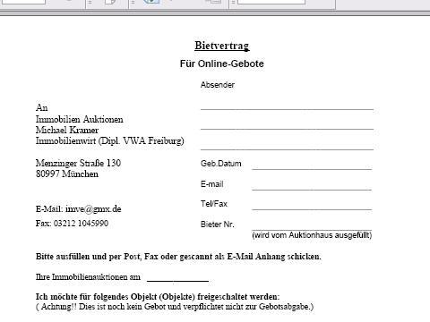 Bevor Sie ein Gebot abgeben können, müssen Sie einen Bietantrag stellen. Diesen benötigt das Auktionshaus aus rechtlichen Gründen. Jetzt können Sie als Bieter freigeschaltet werden. Den Bietantrag können Sie hier als PDF Dokument herunterladen und ausdrucken. Füllen Sie den Bietantrag aus und senden Sie ihn zusammen mit einem Bonitätsnachweis per Fax, Post oder gescannt als E-Mail Anhang dem Auktionshaus zu. Als Bonitätsnachweis dient die Kopie eines Kontoauszug eines Giro-, Spar-, Festgeldkontos, oder ein Depotauszug einer deutschen Bank. Vor der Teilnahme an der Auktion sollten Sie die Versteigerungsbedingungen zur Kenntnis nehmen. |